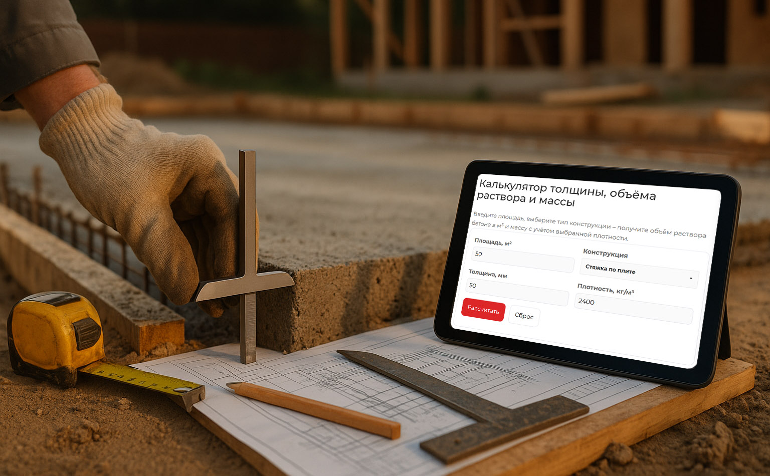 Калькулятор толщины, объёма раствора и массы