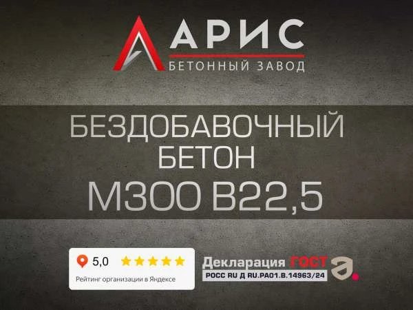 М300 (В22,5) – рабочая марка для монолитных конструкций, где важны прочность, стабильность партии и технологичность укладки. В бездобавочном исполнении бетон производится без химических корректоров состава – вы получаете понятную рецептуру и предсказуемое поведение смеси. На заводе «Арис» бетон выпускается по стабильной схеме дозирования и отгружается с паспортом качества на каждую партию.